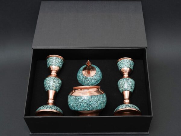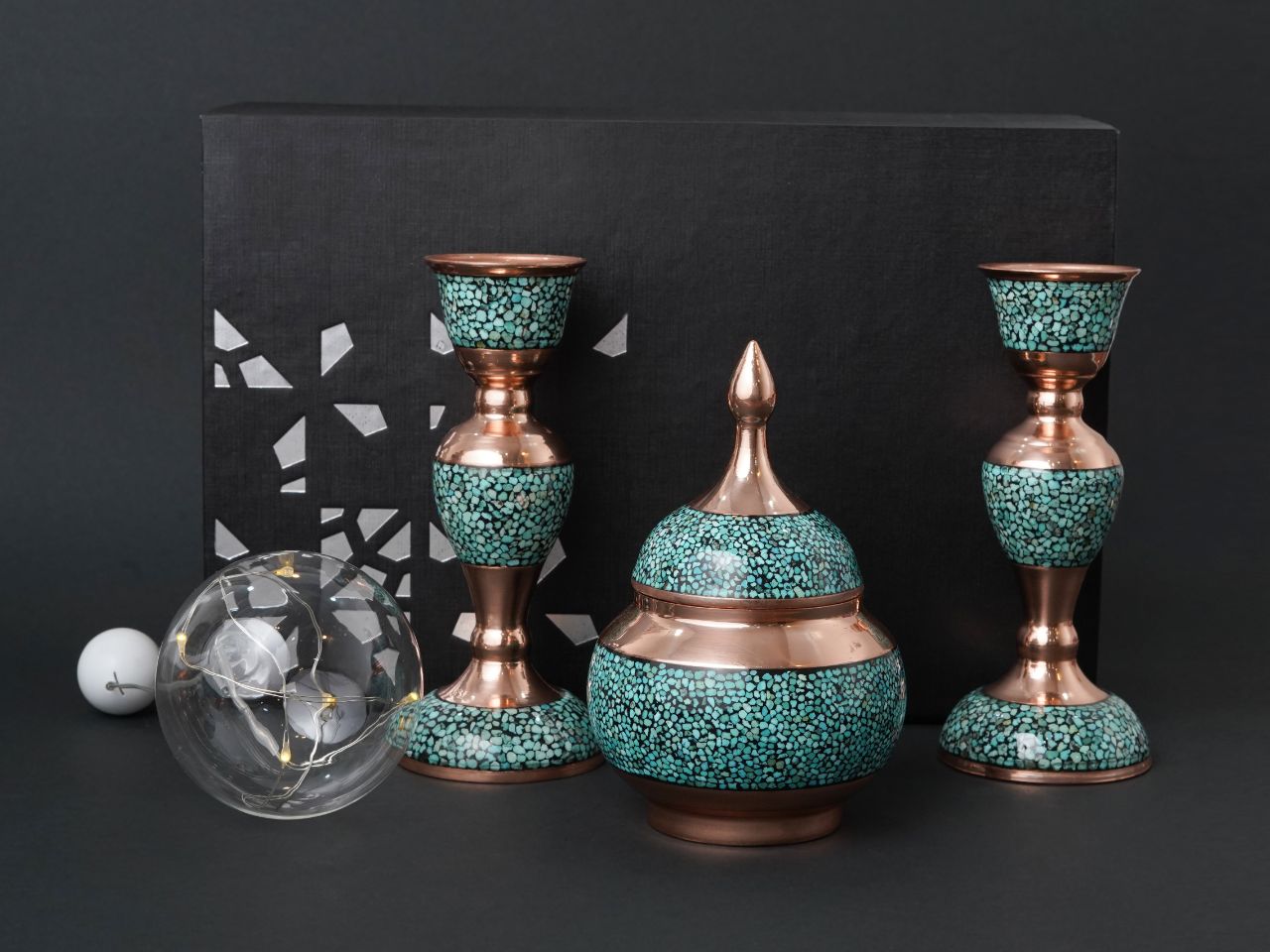 دو عدد شمعدان مس و فیروزه اعلاء با ارتفاع 17 سانت قندان مس و فیروزه اعلا سایز 16