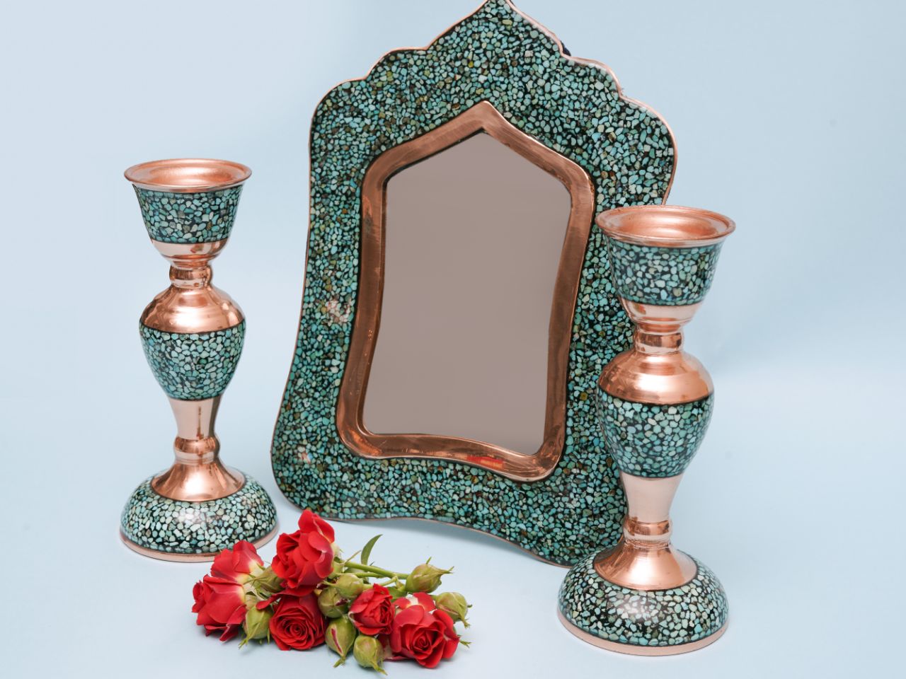 دو عدد شمعدان مس و فیروزه اعلاء با ارتفاع 16 آینه مس و فیروزه اعلاء با ارتفاع 20